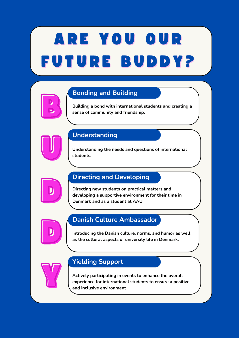 Som buddy, har du ofte en afgørende rolle i, at den nye internationale studerende får et godt ophold i Danmark og på AAU. Samtidig får du nye kompetencer, bl.a. indblik i andre kulturer, sprog, samfund - og du får en masse unikke oplevelser, mens du udvider dit netværk socialt og geografisk.